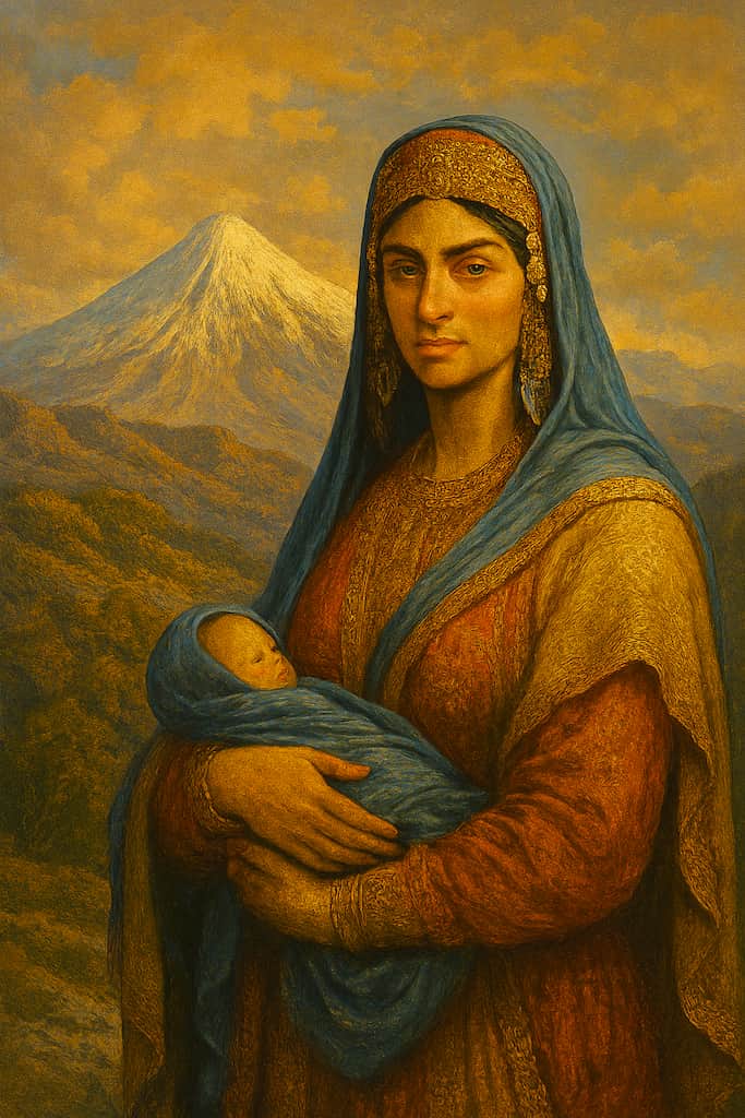 فرانک، نماد مادرانگی و مقاومت در شاهنامه؛ با چهره‌ای آرام و مصمم، کودک را در آغوش گرفته و در دامنه‌های کوهستانی ایستاده است.