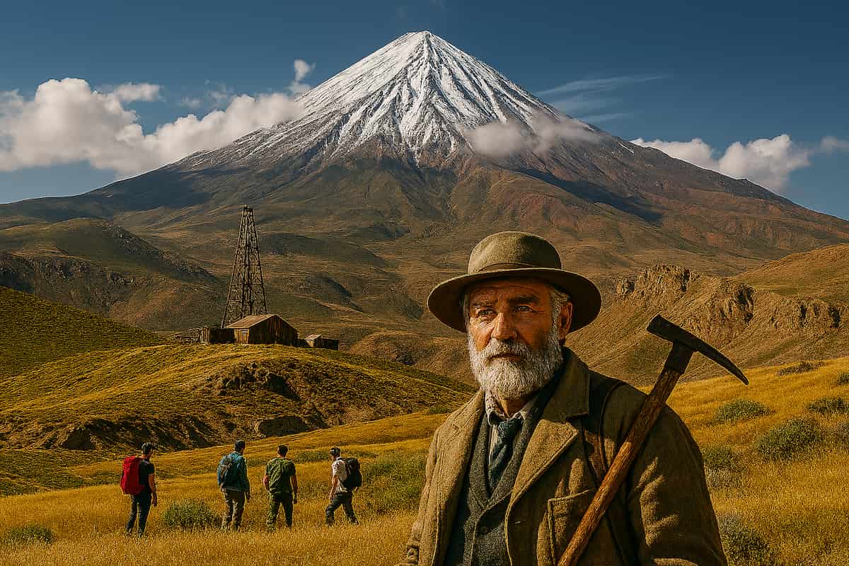 ژرفای دماوند – تصویری واقع‌گرایانه و گسترده از دماوند، نماد ژئوتوریسم ایران، با حضور گردشگران و عناصر زمین‌شناسی منحصربه‌فرد.