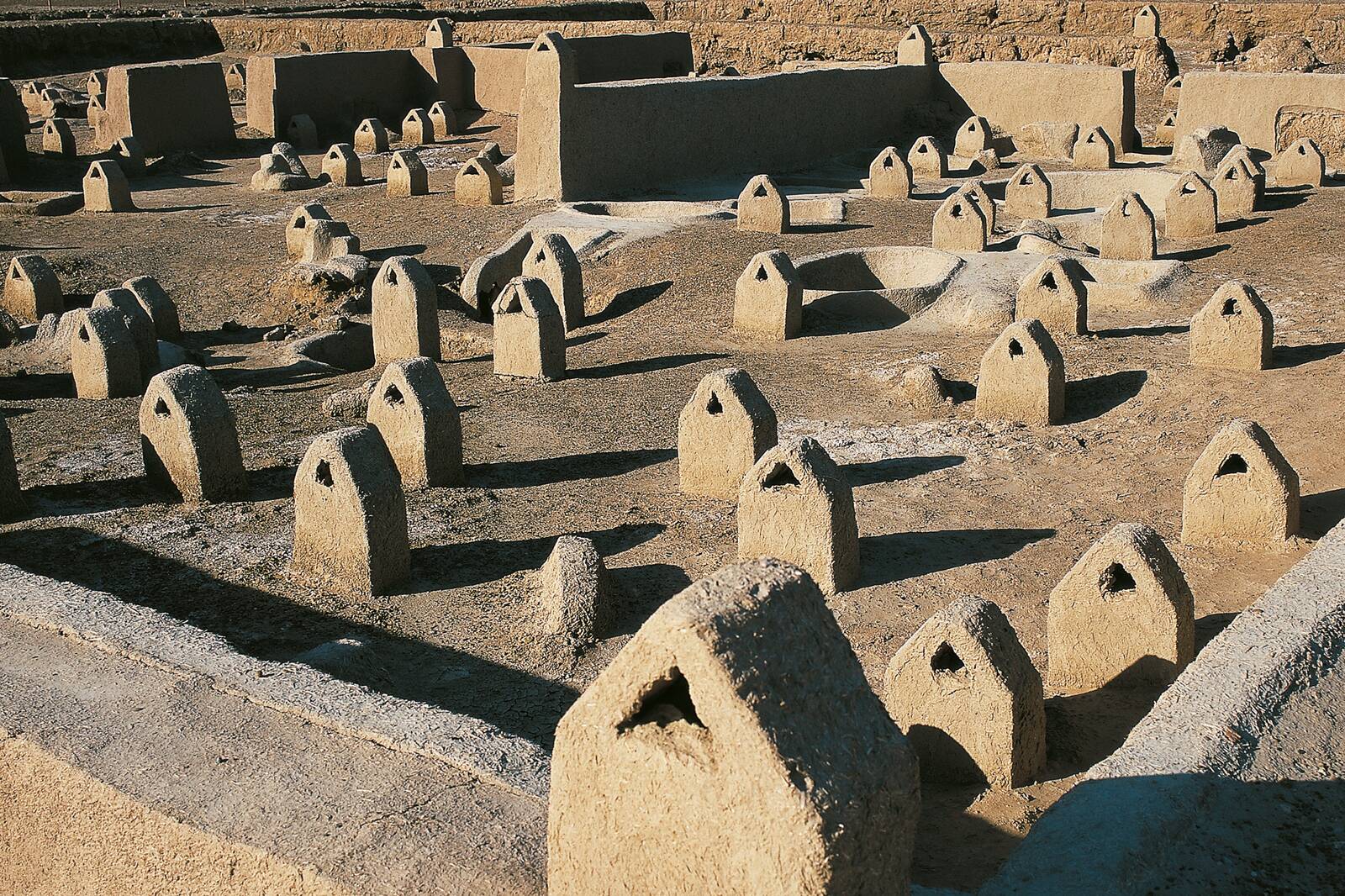 گورستان عظیم با هزاران قبر: بخشهایی از شهر به گورستان اختصاص داشته؛ شمار قابل توجهی از قبرها (به گفته برخی منابع بین ۲۰ تا ۲۵ هزار قبر) کشف شدهاند. این گورستانها منبع مهمی برای مطالعه انسانشناسی، سلامت، تغذیه، ساختار جمعیت و مرگ و تدفین در آن دوره هستند.