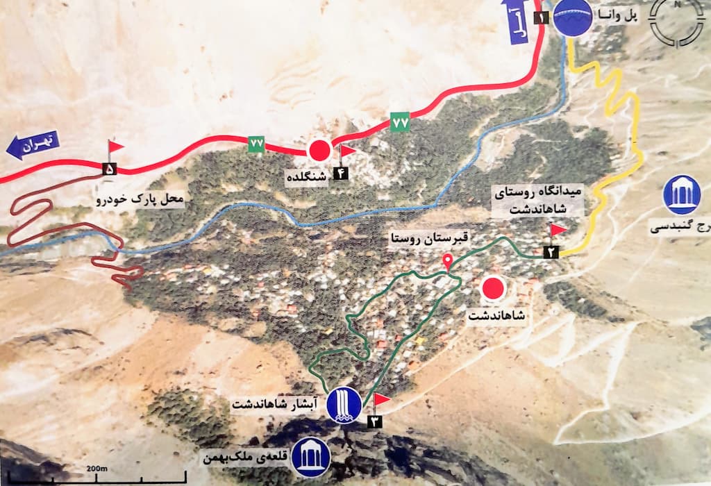 از روی پل که عبور کردید، بلافاصله بعد از پل سمت راست شما مسیر آسفالت شده ای وجود دارد که به موازات رودخانه ی هراز و خلاف جهت آب پیش می رود. آلاچیق هایی نیز در این قسمت وجود دارند که می توانید برای استراحت آن ها را اجاره نمایید. انتهای این مسیر بعد از حدود دو کیلومتر به روستای شاهاندشت می رسد که تمامی مسیر آن آسفالت شده است خودروی خود را در میدان روستا ۲ پارک نمایید و با ورود به روستا به سمت آبشار حرکت کنید.