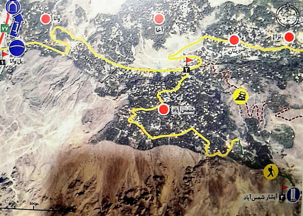 همان طور که در معرفی آبشار شاهاندشت و پل وانا گفتیم، بعد از عبور از پل وانا مسیر سمت راست به روستای شاهاندشت می رود. اگر وارد مسیر شاهاندشت نشوید و مسیر را به سمت شرق ادامه دهید، وارد جاده آسفالت می شوید که به سمت منطقه ی امیری می رود. این منطقه از آبادی های زیادی تشکیل شده است. اولین روستا در سمت چپ و راست روستای واناست. حدود 2/5 کیلومتر که از دو راهی وانا دور شوید، مسیر روستای شمس آباد در سمت راست به وسیله ی یک پل از جاده اصلی امیری جدا می شود.