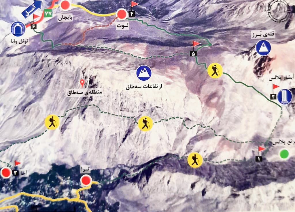 مسیر دوم  وقتی به پل وانا رسیدید، به روستای آخا که قبل از روستای دینان و ترا قرار دارد بروید و از شمال روستای آخا  مسیر پاکوبی را که شیب می گیرد و به سمت سه طاق می رود، ادامه دهید این مسیر بعد از قرار گرفتن در زیر صخره ها جهت شرقی می گیرد و با کمربُر (تراورس) کردن کوه به سمت دره ی پلالس می رود، به طوری که شما سمت راست و پایین دست خود روستای ترا و دیگر روستاهای منطقه را به راحتی مشاهده می کنید.