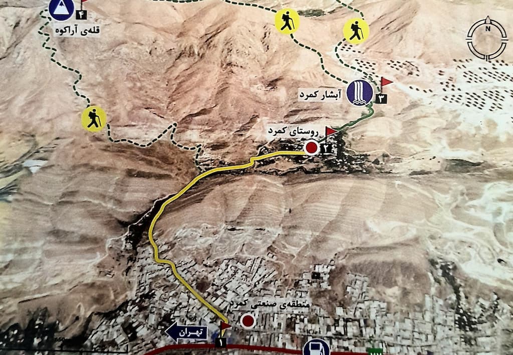 از لب جاده اصلی تا روستای کمرد، سه کیلومتر راه دارید که پیاده طی کردن آن، کم­تر از یک ساعت به طول می­ انجامد. اگر وسیله­ ی شخصی دارید، بعد از همان پل عابر پیاده و قبل از پمپ بنزین کمرد از طریق یک دوربرگردان، به سمت تهران تغییر مسیر دهید. مراقب باشید اگر این دوربرگردان را رد کنید، باید تا دور برگردان بعدی یعنی بعد از پل اتوبان تهران – پردیس برانید. بعد از اینکه دور زدید، وارد اولین خیابان عریض سمت راست خود شوید و در اولین تقاطع به سمت بپیچید تا بعد از کمتر از سه کیلومتر در مسیری آسفالت، به ده کمرد برسید.