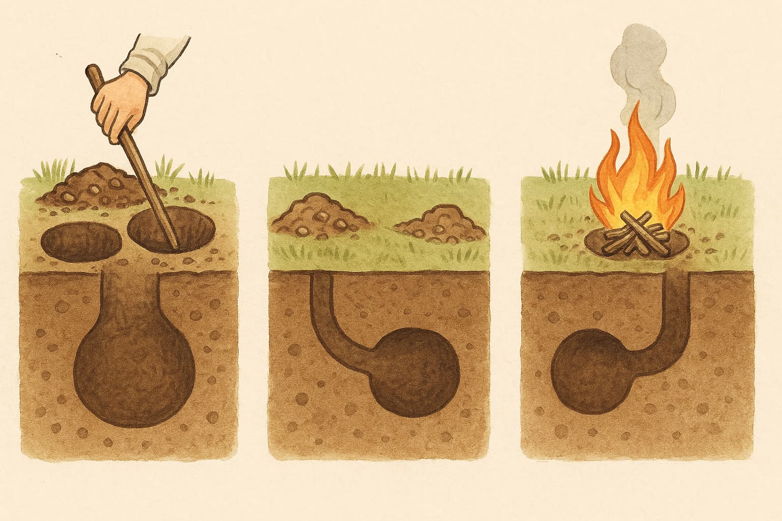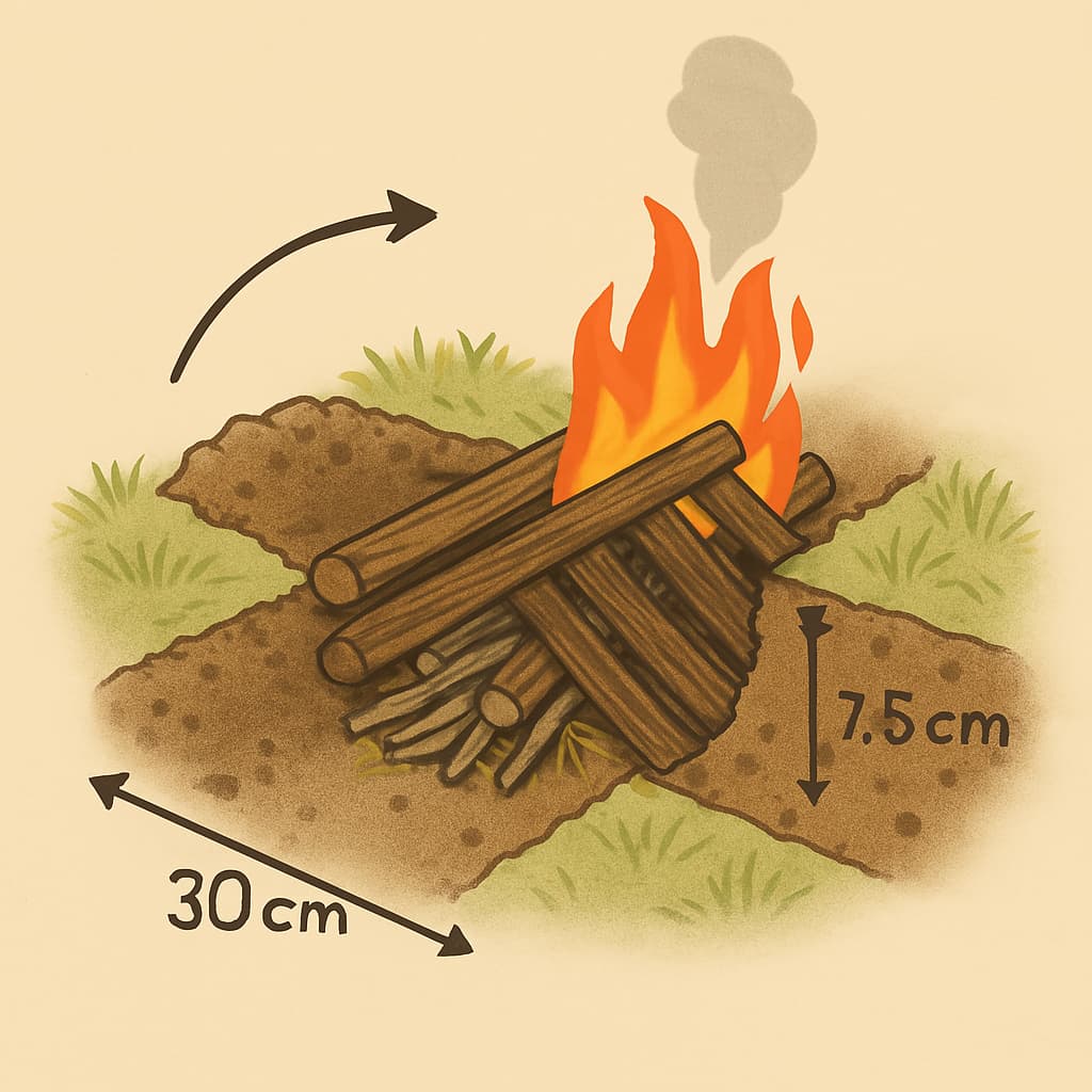 گودال تقاطعی به اندازه ۳۰ سانتیمتر و عمق ۷/۵ سانتیمتر مطابق شکل ایجاد کنید مواد آتش گیر اولیه را در چاله به صورت طولی انباره کنید چوب ها را برروی آنها بگذارید. در این روش باد به صورت هدایت شده به سمت مرکز آتش هدایت می شود .