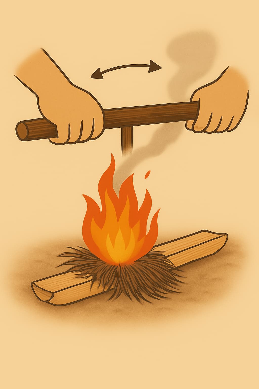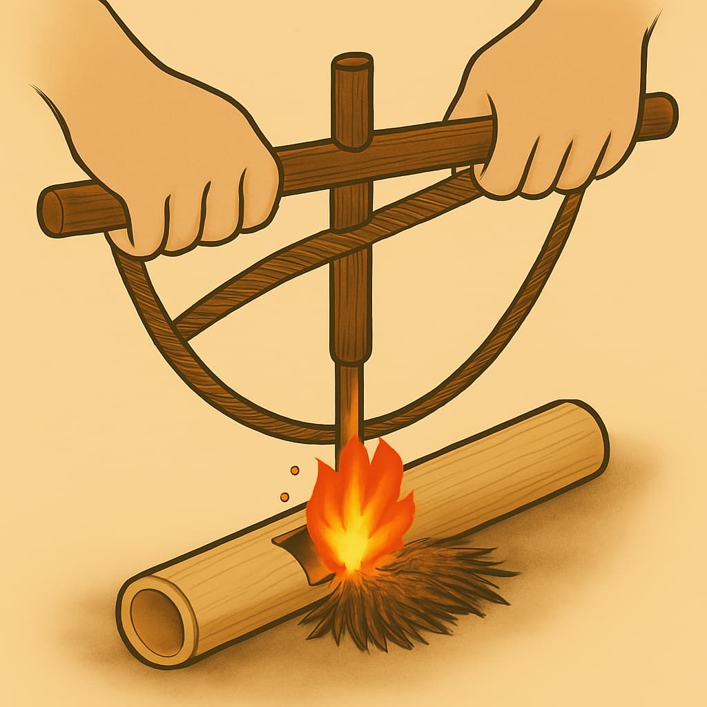 نواری به ضخامت ۶ میلی متر و به طول ۶۰ سانتیمتری از خیزران خشک و تکه چوب خشک تهیه کنید. یک طرف چوب را روی زمین بگذارید و طرف دیگر را به وسیله یک تکه سنگ یک متر از روی زمین بلند کنید. روی انتهای تکه چوب شیاری ایجاد نمایید. دهانه شیار را گشادتر کنید، مقداری آتش زنه در انتهای شیار قرار دهید ولی فضایی را برای حرکت تسمه در شیار پیش بینی کنید. چوب را به وسیله پا یا زانو بر روی زمین محکم و عمل کشیدن تسمه به طرفین را آغاز کنید.