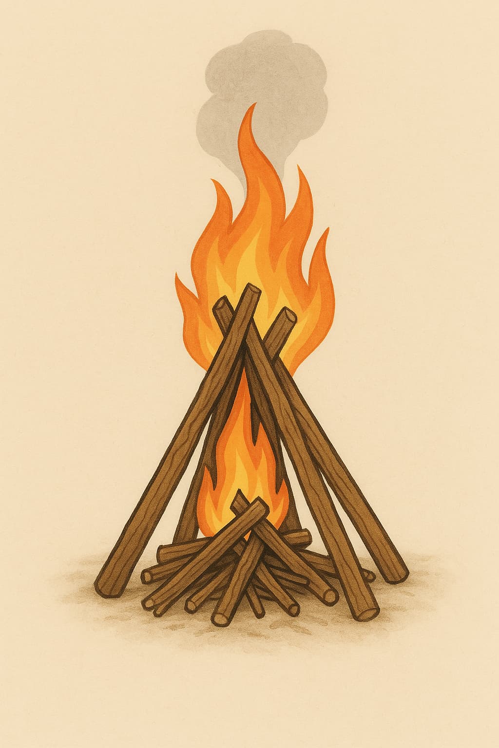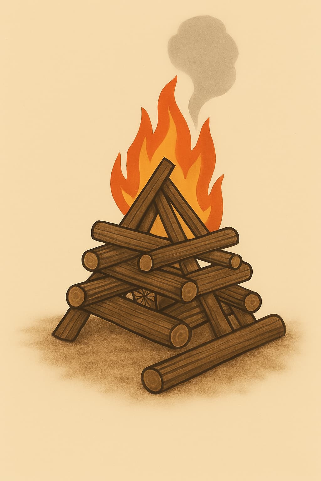 در این روش دسته های چوب را به صورت خیمه و مخروطی شکل بچینید و مواد اولیه جهت روشن کردن را در وسط قرار دهید و آتش را روشن کنید. در این روش به مرور آتش توسط لایه های بیرونی چوب تغذیه میشود و برای چوب های تر هم شرایط را برای سوختن فراهم می نماید.
