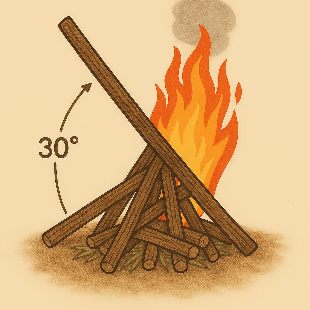 برای شروع ، تکه چوب سبزی را با زاویه ۳۰ درجه در زمین ثابت کنید. این زاویه در نقطه اتصال به زمین در جهت باد باشد. مواد آتش زا را در زیر آن قرار داده با چوب هایی روی آن را به صورتی که در شکل نشان داده شده است بپوشانید. آتش را روشن کنید و به تناسب برروی آن چوبها را قرار دهید.