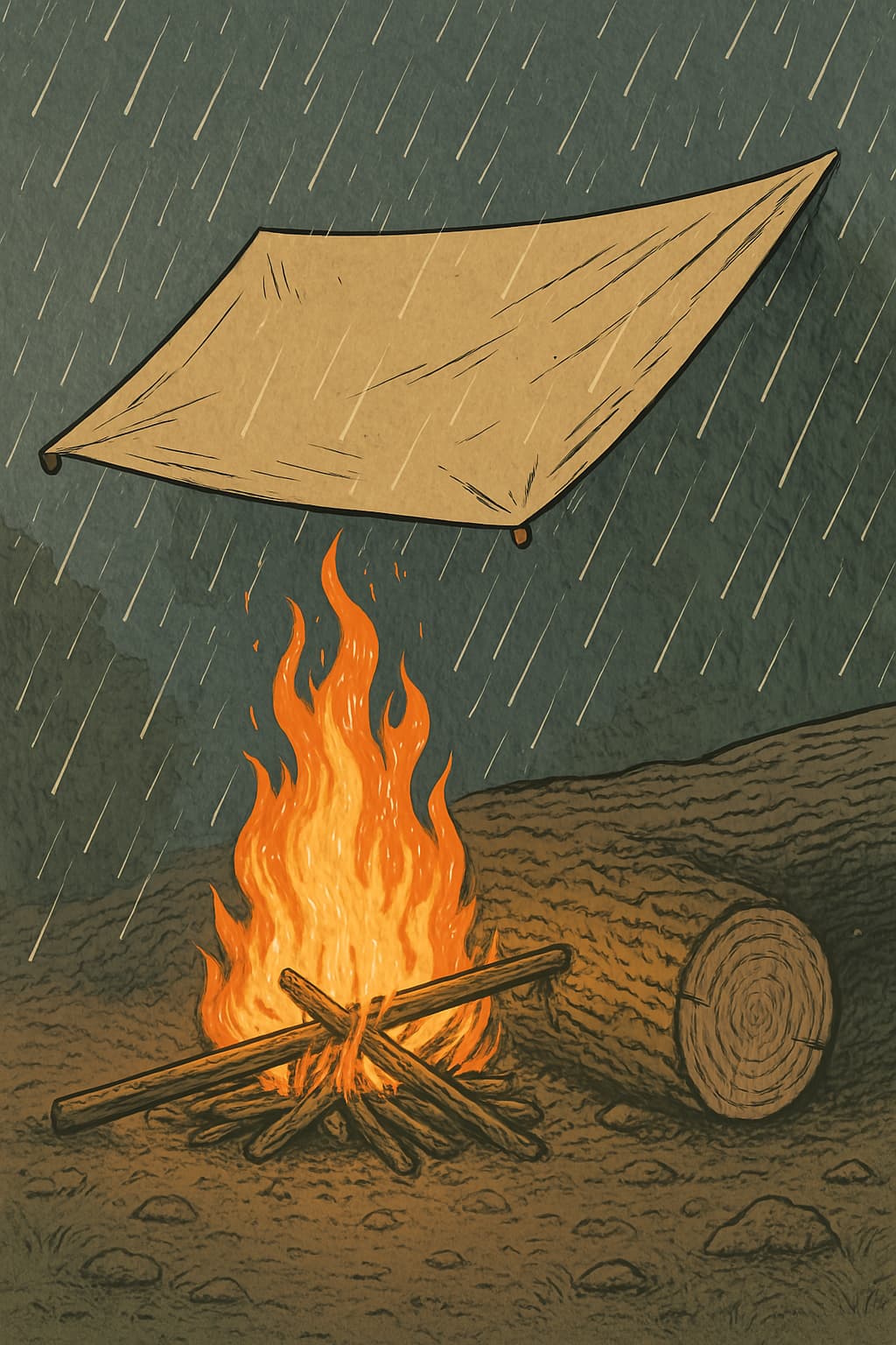 در روزهای بارانی می توان از زیر صخره های شیب دار، داخل کنده های پوسیده درختان، سوخت خشک پیدا کرد. به دنبال درخت افتاده ای بگردید که به سمت جنوب روی زمین افتاده باشد زیرا پوست و چوب قسمت زیرین آن خشک خواهد بود. اگر جهت بارش باران ثابت است از یک پارچه کرباس روغن اندود و یا پارچه ای ضد آب استفاده کنید تا جلوی بارش باران را بگیرید. فاصله این پارچه تا آتش باید مناسب باشد تا دراثر وزش باد شعله به آن سرایت نکند.