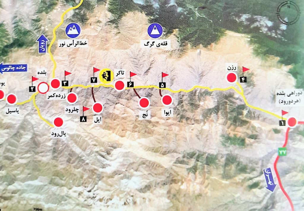 - 30 کیلومتر قبل از شهر بلده، به دوراهی روستای ایوا میرسید که از سمت جاده جدا می شود و بعد از حدود سه کیلومتر در مسیر خاکی، در ارتفاع ۲۰۰۰ متری، به روستای ایوا می رسد. دامنه های جنوبی این روستای کوچک، تا ارتفاع ۳۱۰۰ متری بالا می رود و مسیر مناسبی برای کوه پیمایی دارد.