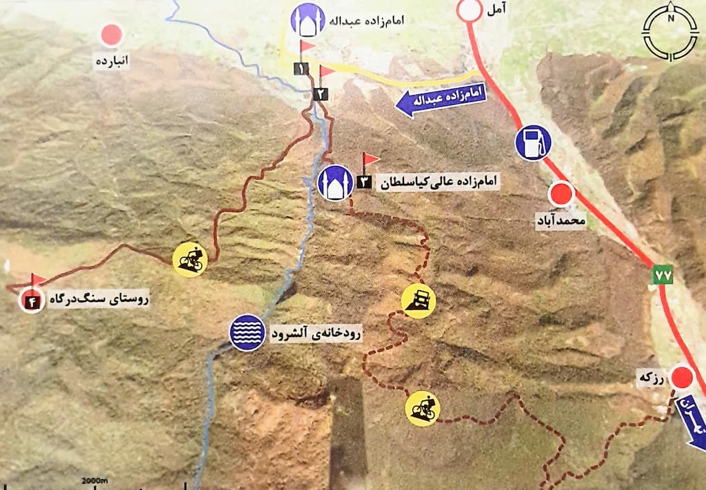 از امام زاده به سمت روستای رزکه یک راه خانگی وجود دارد که برای دوچرخه سواری نیز مناسب است. به دکل ها که رسیدید، با حرکت در جاده خاکی که در آن قرار دارید عرض مسیر دکل را قطع کرده و مسیر خاکی را ادامه دهید.