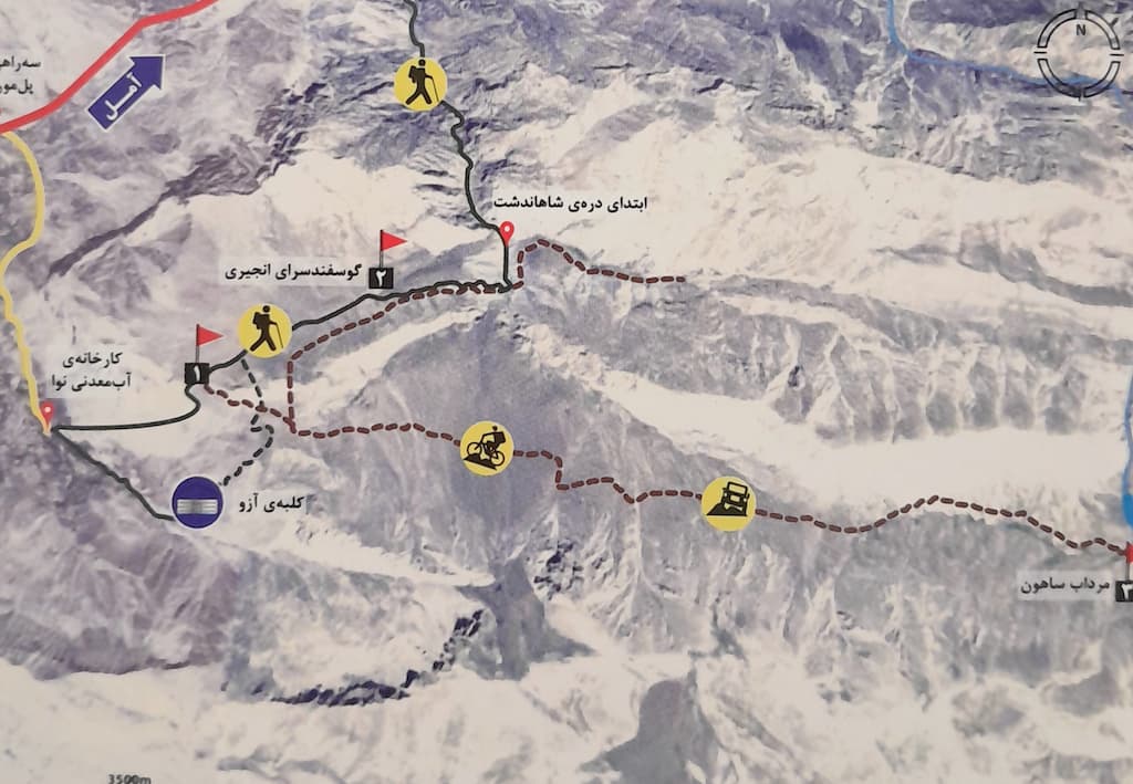 در ابتدای مسیر، اگر سمت راست خود نگاه کنید یک جاده خاکی می بینید حدود ده کیلومتر مسیر خود را در این جاده خاکی به سمت شرق ادامه دهید به ساهون می رسید. (مراقب باشید به جهت شمالی جاده نروید این جاده ابتدا در جهت جنوب و سپس در جهت شرق امتداد دارد.)