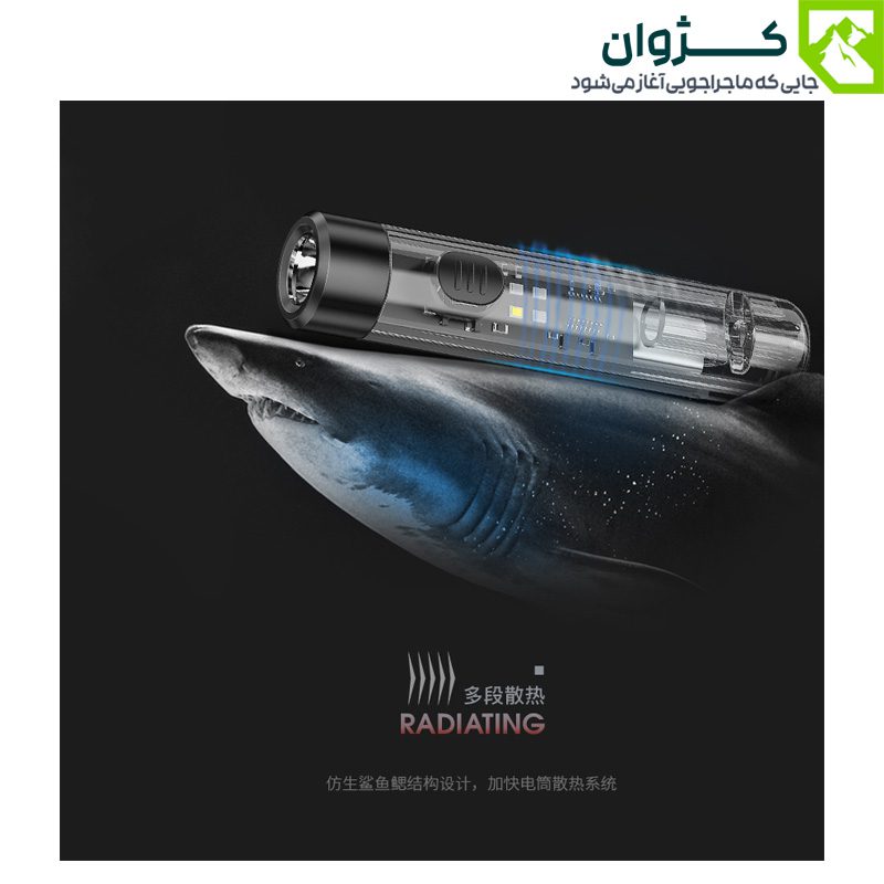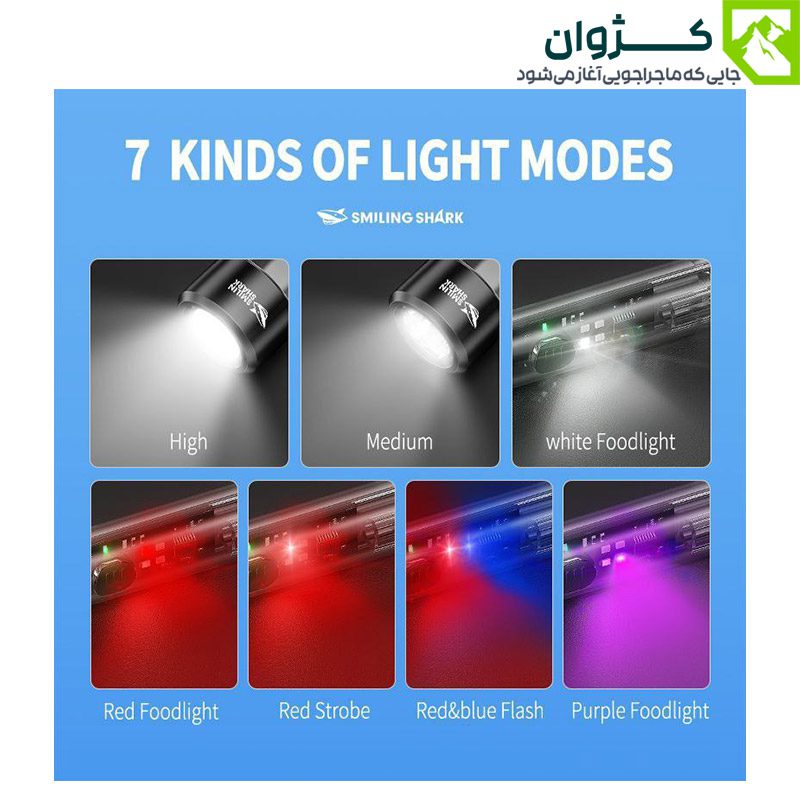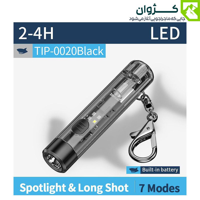 چراغ قوه مینی اسمایلینگ شارک کد TIP-0020 دارای LED SMD پر قدرت در جلو و نور جانبی COB می باشد. نور جانبی روشنایی گشترده و یکنواخت فراهم می کن د و برای محیط های تاریک و کمپینگ مناسب است. نور LED جلویی نیز مسیرهای تاریک را به خوبی روشن می کند و امکان دید بهتر در شرایط کم نور را فراهم می کند. این چراغ قوه با شدت نوردهی 80 لومن، دارای 7 حالت نوری مختلف می باشد.