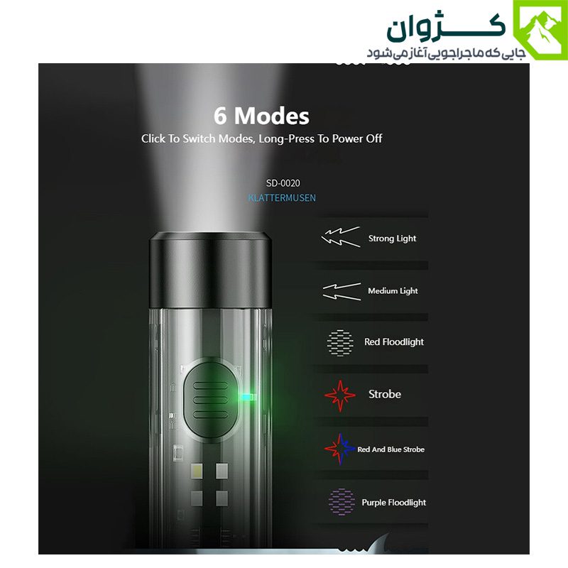 نور اصلی چراغ قوه دو حالت قوی و ضعیف دارد. نور جانبی COB دارای 5 حالت است که شامل نور سفید، قرمز، قرمز چشمک زن، پلیسی و بنفش می باشد. این تنوع نوردهی باعث می شود چراغ قوه در شرایط مختلف اعم از مسیرهای تاریک، و شرایط اضطراری قابل استفاده باشد.